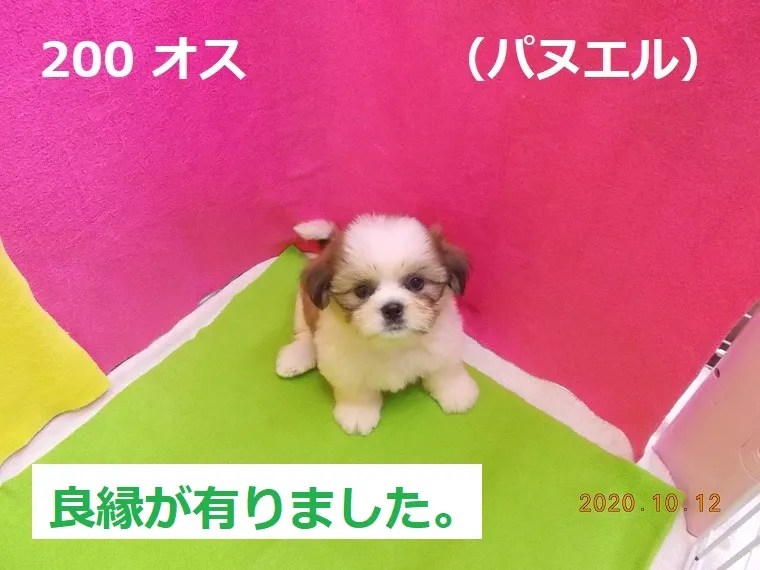 200 オス パヌエル 2020/08/21 番号 200 性別 オス 仮名 パヌエル 価格 良縁が有りました。 パヌエル 生年月日 2020年8月18日 19:00頃 血統書 有り(JKC) 母「キャベツ」、父「ヒッタ」 お引き渡しは10月20日以降になります。