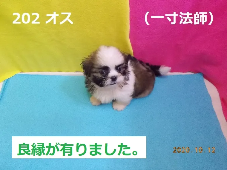 202 オス 一寸法師(いっすんぼうし) 2020/08/24 番号 202 性別 オス 仮名 一寸法師(いっすんぼうし) 価格 良縁が有りました。 一寸法師 生年月日 2020年8月21日 16:00頃 血統書 有り(JKC) 母「小麦」、父「ヒッタ」 お引き渡しは10月21日以降になります。