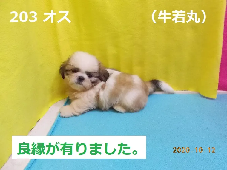 203 オス 牛若丸(うしわかまる) 2020/08/24 番号 203 性別 オス 仮名 牛若丸(うしわかまる) 価格 良縁が有りました。 牛若丸 生年月日 2020年8月21日 16:30頃 血統書 有り(JKC) 母「小麦」、父「ヒッタ」 お引き渡しは10月21日以降になります。