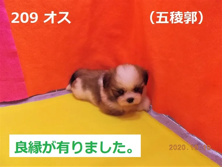 209 オス 五稜郭(ごりょうかく) 2020/08/30 番号 209 性別 オス 仮名 五稜郭(ごりょうかく) 価格 良縁が有りました。 五稜郭 生年月日 2020年8月26日 14:24頃 血統書 有り(JKC) 母「富士子」、父「ヒッタ」 お引き渡しは10月27日以降になります。