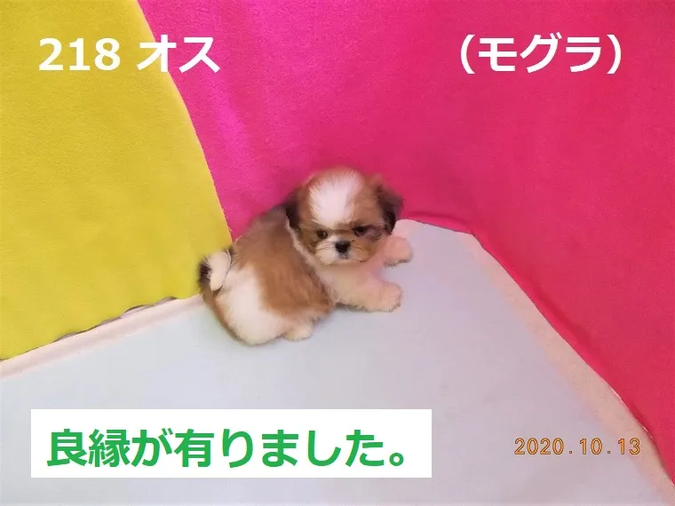 218 オス モグラ 2020/09/03 番号 218 性別 オス 仮名 モグラ 価格 良縁が有りました。 モグラ 生年月日 2020年8月23日 17:10頃 血統書 有り(JKC) 母「キララ」、父「リンゴ」 お引き渡しは10月24日以降になります。