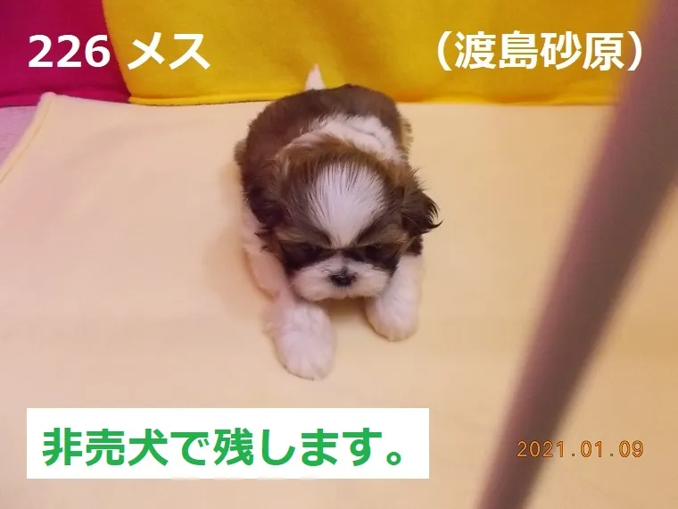 226 メス 渡島砂原(おしまさわら) 2020/12/03 番号 226 性別 メス 仮名 渡島砂原(おしまさわら) 価格 非売犬で残します。 渡島砂原 生年月日 2020年11月29日 17:20頃 血統書 有り(JKC) 母「理科」、父「リンゴ」非売犬ですが、参考情報として掲載致します。