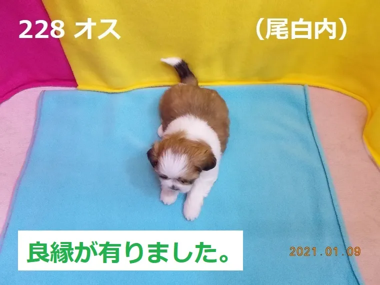 228 オス 尾白内(おしろない) 2020/12/03 番号 228 性別 オス 仮名 尾白内(おしろない) 価格 良縁が有りました。 尾白内 生年月日 2020年11月29日 19:37頃 血統書 有り(JKC) 母「明鏡止水」、父「リンゴ」 お引き渡しは2021年1月30日以降になります。