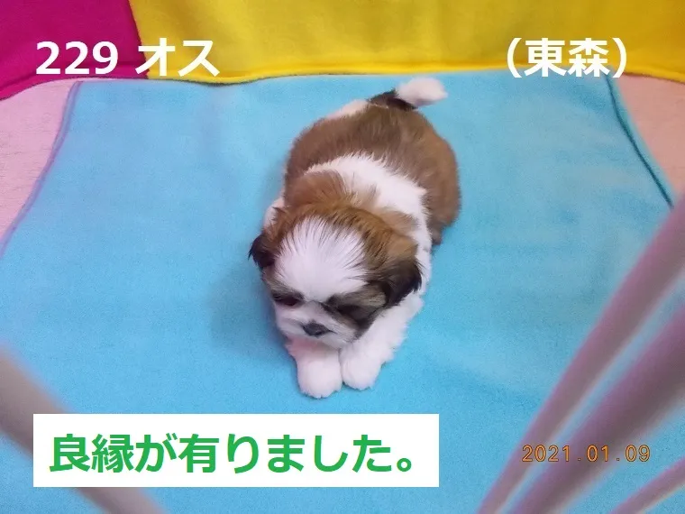 229 オス 東森(ひがしもり) 2020/12/03 番号 229 性別 オス 仮名 東森(ひがしもり) 価格 良縁が有りました。 東森 生年月日 2020年11月29日 19:53頃 血統書 有り(JKC) 母「明鏡止水」、父「リンゴ」 お引き渡しは2021年1月30日以降になります。