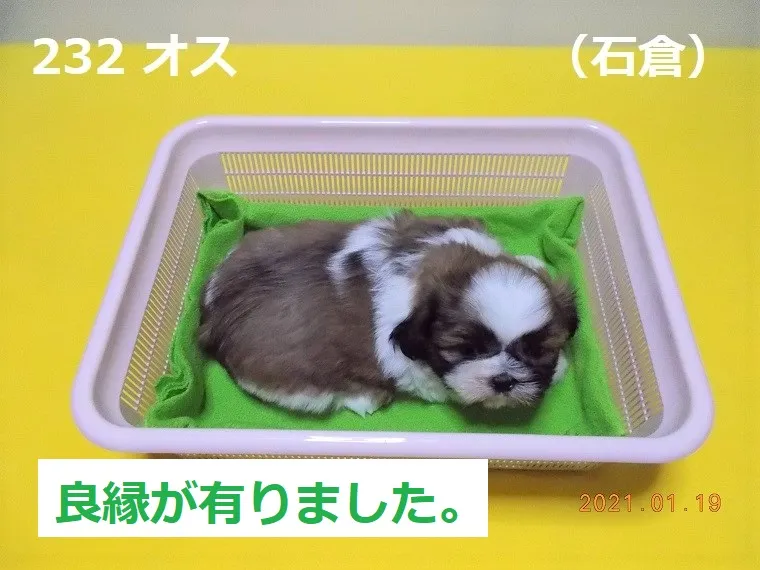 232 オス 石倉(いしくら) 2020/12/14 番号 232 性別 オス 仮名 石倉(いしくら) 価格 良縁が有りました。 石倉 生年月日 2020年12月10日 16:38頃 血統書 有り(JKC) 母「サチ」、父「大麦」 お引き渡しは2021年2月9日以降になります。