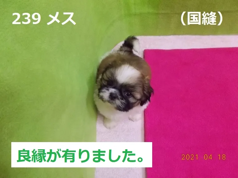 239 メス 国縫(くんぬい) 2021/03/02 番号 239 性別 メス 仮名 国縫(くんぬい) 価格 良縁が有りました。 国縫 生年月日 2021年2月26日 14:35頃 血統書 有り(JKC) 母「送電」、父「リンゴ」 お引き渡しは4月28日以降になります。