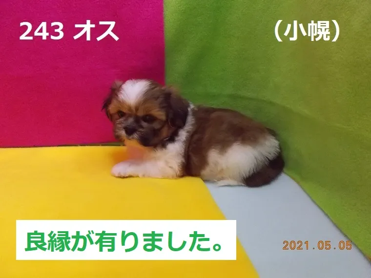 243 オス 小幌(こぼろ) 2021/03/20 番号 243 性別 オス 仮名 小幌(こぼろ) 価格 良縁が有りました。 小幌 生年月日 2021年3月16日 7:40頃 血統書 有り(JKC) 母「レタス」、父「充電」 お引き渡しは5月18日以降になります。★右前足の足首負傷(切断)、原因不明です。
