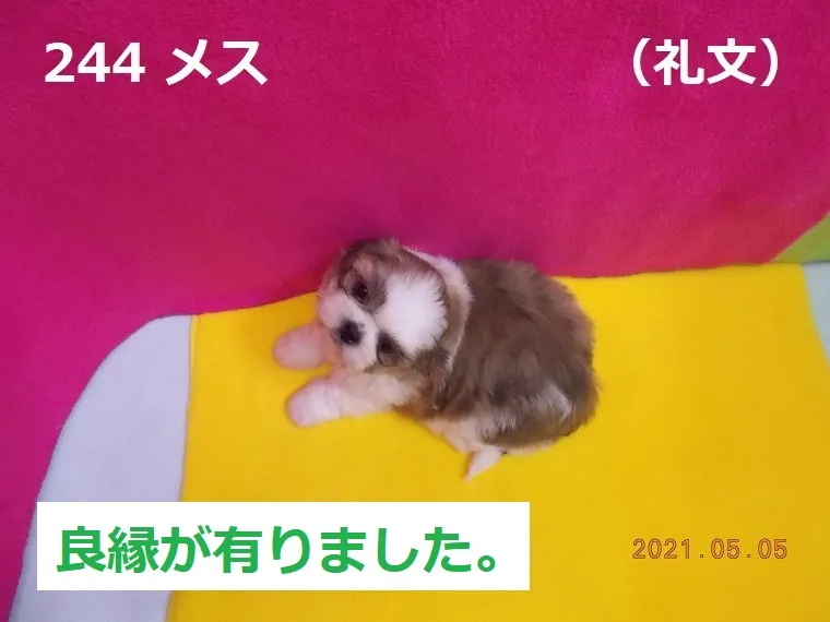 244 メス 礼文(れぶん) 2021/03/20 番号 244 性別 メス 仮名 礼文(れぶん) 価格 良縁が有りました。 礼文 生年月日 2021年3月16日 8:00頃 血統書 有り(JKC) 母「レタス」、父「充電」 お引き渡しは5月18日以降になります。