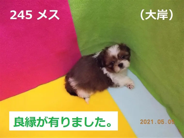 245 メス 大岸(おおきし) 2021/03/20 番号 245 性別 メス 仮名 大岸(おおきし) 価格 良縁が有りました。 大岸 生年月日 2021年3月16日 17:00頃 血統書 有り(JKC) 母「レタス」、父「充電」 お引き渡しは5月18日以降になります。