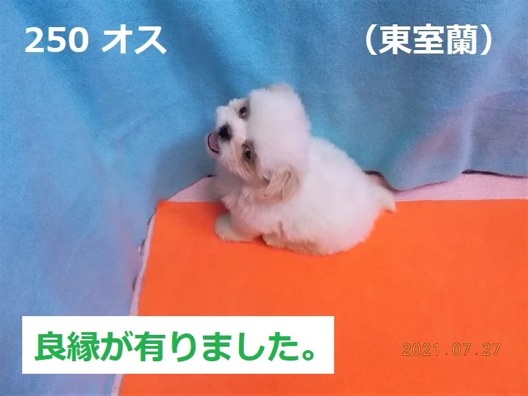 250 オス 東室蘭(ひがしむろらん) 2021/07/27 番号 250 性別 オス 仮名 東室蘭(ひがしむろらん) 価格 良縁が有りました。 東室蘭 生年月日 2021年6月7日 23:15頃 血統書 有り(JKC) 母「トマト」、父「ヒッタ」 お引き渡しは8月7日以降になります。ホワイトシーズー(狛犬)です。
