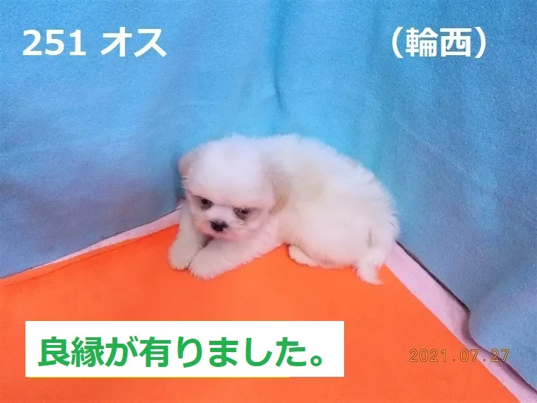 251 オス 輪西(わにし) 2021/07/27 番号 251 性別 オス 仮名 輪西(わにし) 価格 良縁が有りました。 輪西 生年月日 2021年6月7日 23:55頃 血統書 有り(JKC) 母「トマト」、父「ヒッタ」 お引き渡しは8月7日以降になります。ホワイトシーズー(狛犬)です。2センチ位の出べそが有ります。目が白濁かも 。
