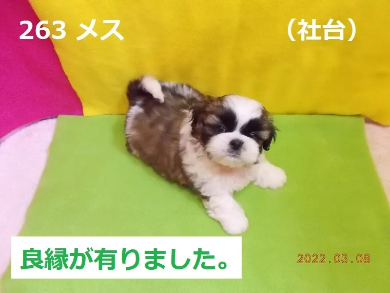 263 メス 社台(しゃだい) 2022/03/08 番号 263 性別 メス 仮名 社台(しゃだい) 価格 良縁が有りました。 社台 生年月日 2022年1月17日 14:45頃 血統書 有り(JKC) 母「送電」、父「リンゴ」 お引き渡しは3月19日(土)以降になります。