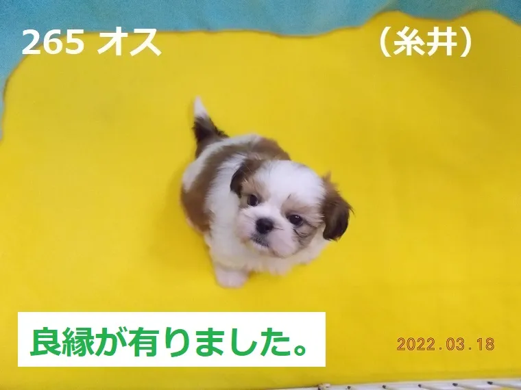 265 オス 糸井(いとい) 2022/03/18 番号 265 性別 オス 仮名 糸井(いとい) 価格 良縁が有りました。 糸井 生年月日 2022年1月27日 12:18頃 血統書 有り(JKC) 母「ユキ」、父「大麦」 お引き渡しは3月29日(火)以降になります。