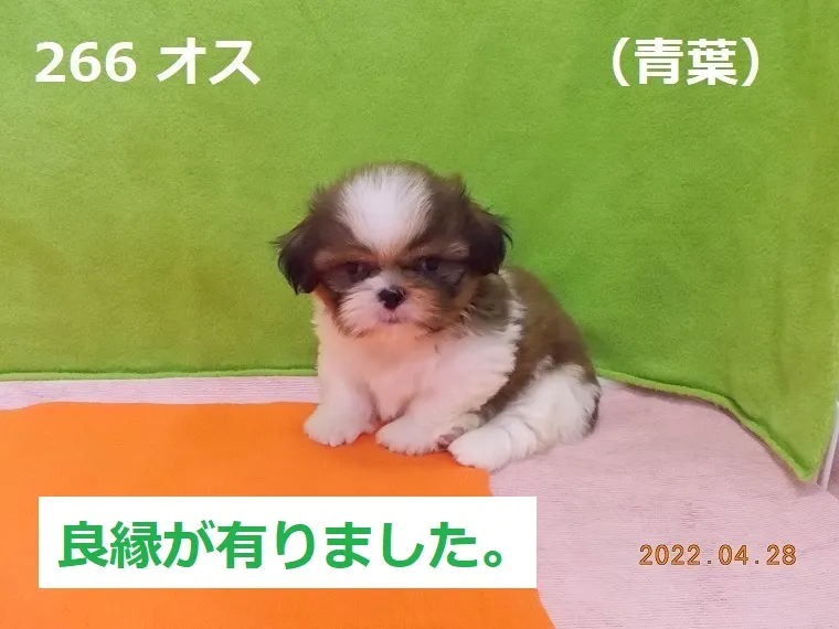 266 オス 青葉(あおば) 2022/04/28 番号 266 性別 オス 仮名 青葉(あおば) 価格 良縁が有りました。 青葉 生年月日 2022年3月9日 8:43頃 血統書 有り(JKC) 母「キャベツ」、父「ヒッタ」 お引き渡しは5月10日(火)以降になります。尾先に怪我の痕が有ります。