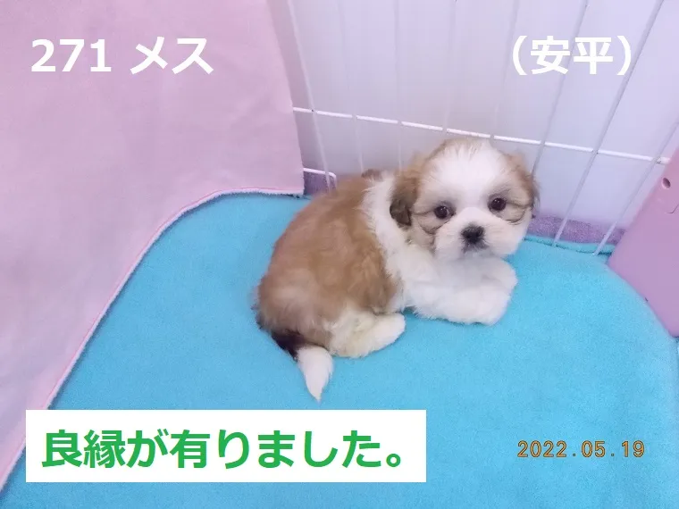 271 メス 安平(あびら) 2022/05/19 番号 271 性別 メス 仮名 安平(あびら) 価格 良縁が有りました。 安平 生年月日 2022年3月30日 14:00頃 血統書 有り(JKC) 母「明鏡止水」、父「ヒッタ」 お引き渡しは5月31日(火)以降になります。