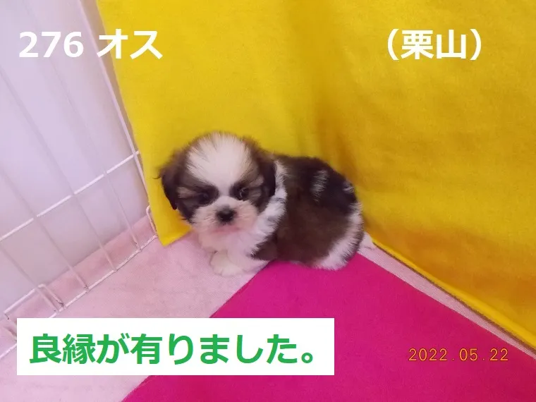 276 オス 栗山(くりやま) 2022/05/22 番号 276 性別 オス 仮名 栗山(くりやま) 価格 良縁が有りました。 栗山 生年月日 2022年4月2日 20:36頃 血統書 有り(JKC) 母「サチ」、父「大麦」 お引き渡しは6月2日(木)以降になります。