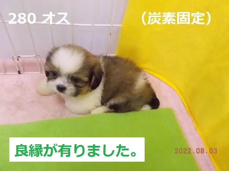 280 オス 炭素固定(たんそこてい) 2022/08/03 番号 280 性別 オス 仮名 炭素固定(たんそこてい) 価格 良縁が有りました。 炭素固定 生年月日 2022年6月14日 7:52頃 血統書 有り(JKC) 母「レタス」、父「大麦」 お引き渡しは8月17日(水)以降になります。