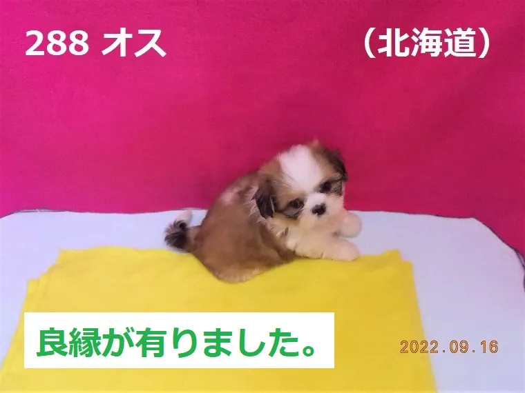 288 オス 北海道(ほっかいどう) 2022/09/16 番号 288 性別 オス 仮名 北海道(ほっかいどう) 価格 良縁が有りました。 北海道 生年月日 2022年7月28日 2:38頃 血統書 有り(JKC) 母「渡島沼尻」、父「大麦」 お引き渡しは9月27日(火)以降になります。