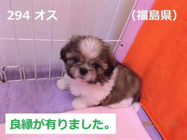 294 オス 福島県(ふくしまけん) 2022/11/26 番号 294 性別 オス 仮名 福島県(ふくしまけん) 価格 良縁が有りました。 福島県 生年月日 2022年10月7日 0:27頃 血統書 有り(JKC) 母「キャベツ」、父「大麦」 お引き渡しは12月7日(水)以降になります。