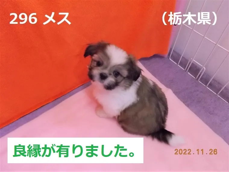 296 メス 栃木県(とちぎけん) 2022/11/26 番号 296 性別 メス 仮名 栃木県(とちぎけん) 価格 良縁が有りました。 栃木県 生年月日 2022年10月7日 6日の23:45頃 血統書 有り(JKC) 母「キャベツ」、父「大麦」 お引き渡しは12月7日(水)以降になります。