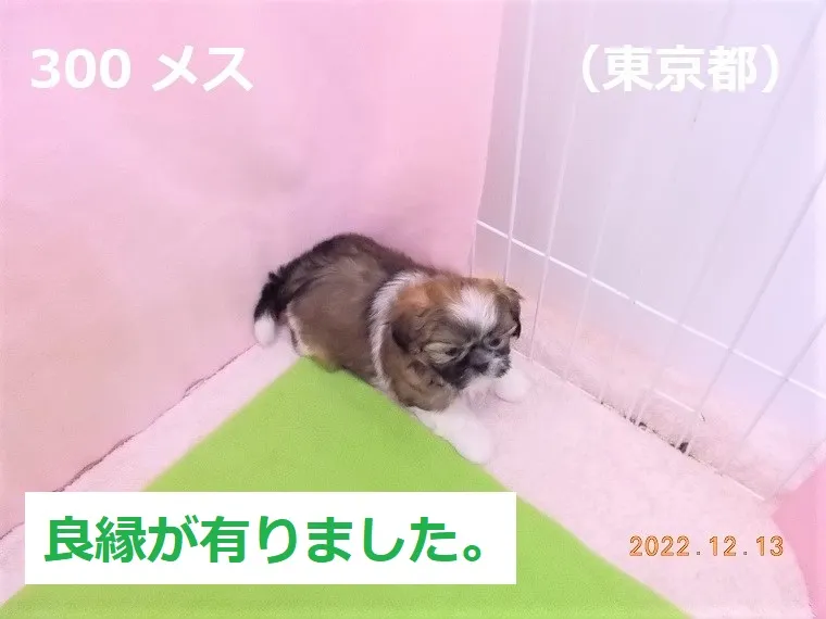 300 メス 東京都(とうきょうと) 2022/12/13 番号 300 性別 メス 仮名 東京都(とうきょうと) 価格 良縁が有りました。 東京都 生年月日 2022年10月24日 15:30頃 血統書 有り(JKC) 母「送電」、父「かえで」 お引き渡しは12月24日(土)以降になります。4月30日(日)を越えて残っていた場合は非売犬になる予定です。