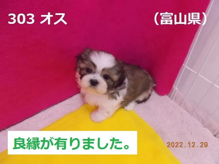 303 オス 富山県(とやまけん) 2022/12/29 番号 303 性別 オス 仮名 富山県(とやまけん) 価格 良縁が有りました。 富山県 生年月日 2022年11月9日 18:11頃 血統書 有り(JKC) 母「伊達紋別」、父「大麦」 お引き渡しは1月11日(水)以降になります。