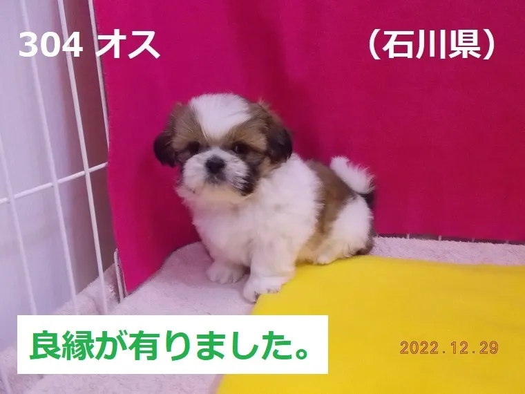 304 オス 石川県(いしかわけん) 2022/12/29 番号 304 性別 オス 仮名 石川県(いしかわけん) 価格 良縁が有りました。 石川県 生年月日 2022年11月9日 19:43頃 血統書 有り(JKC) 母「伊達紋別」、父「大麦」 お引き渡しは1月11日(水)以降になります。