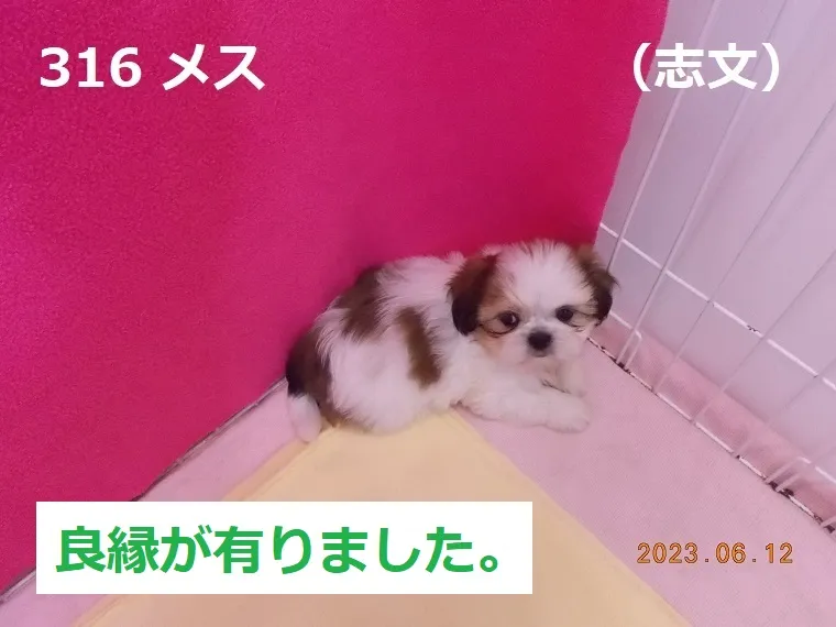 316 メス 志文(しぶん) 2023/06/12 番号 316 性別 メス 仮名 志文(しぶん) 価格 良縁が有りました。 志文 生年月日 2023年4月23日 10:57頃 血統書 有り(JKC) 母「有珠」、父「大麦」 お引き渡しは6月24日(土)以降になります。