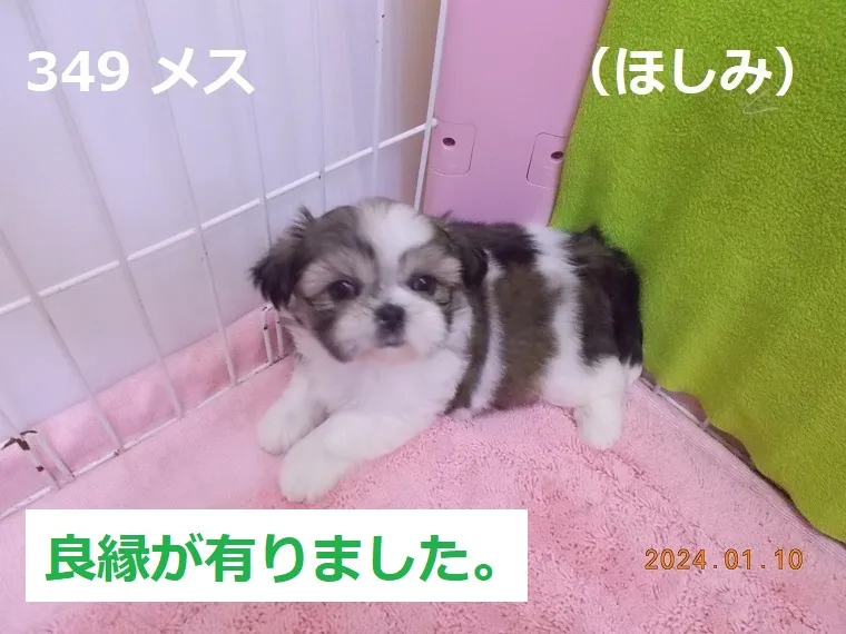 349 メス ほしみ 2024/01/10 番号 349 性別 メス 仮名 ほしみ 価格 良縁が有りました。 ほしみ 生年月日 2023年11月21日 21:17頃 血統書 有り(JKC) 母「伊達紋別」、父「大麦」 お引き渡しは1月23日(火)以降になります。